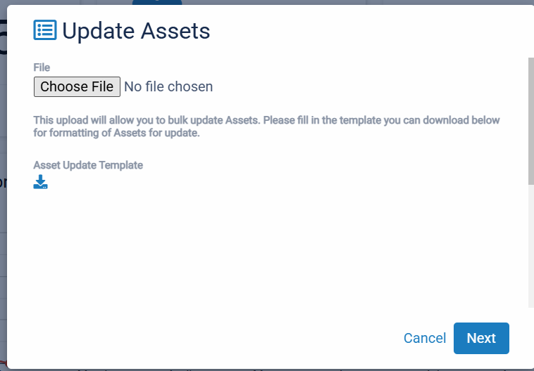 - Launch the Update Assets functionality, upload the file and begin the import.